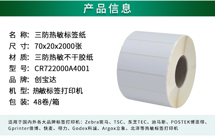 【規(guī)格】卷裝70mm*20mm*2000張(足數(shù):2000張)一箱裝48卷