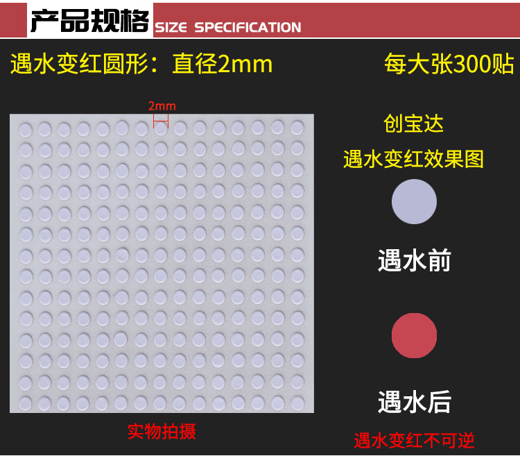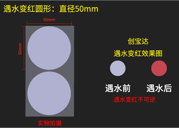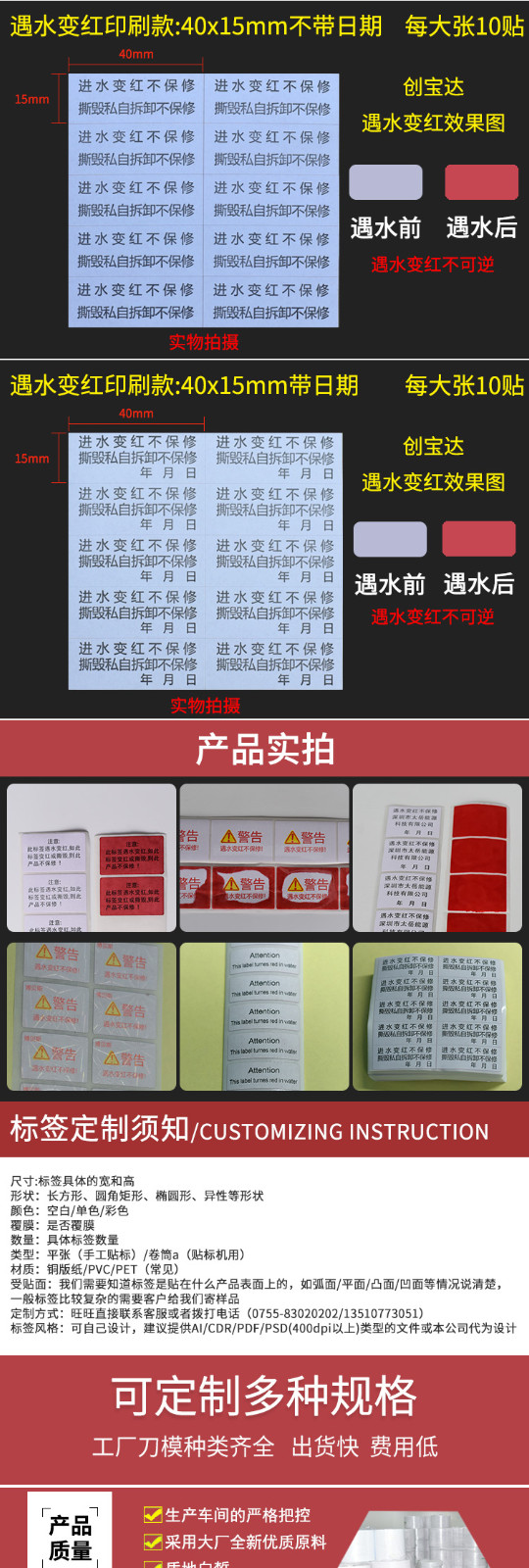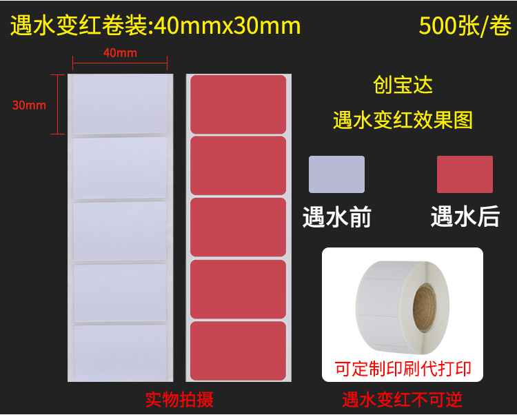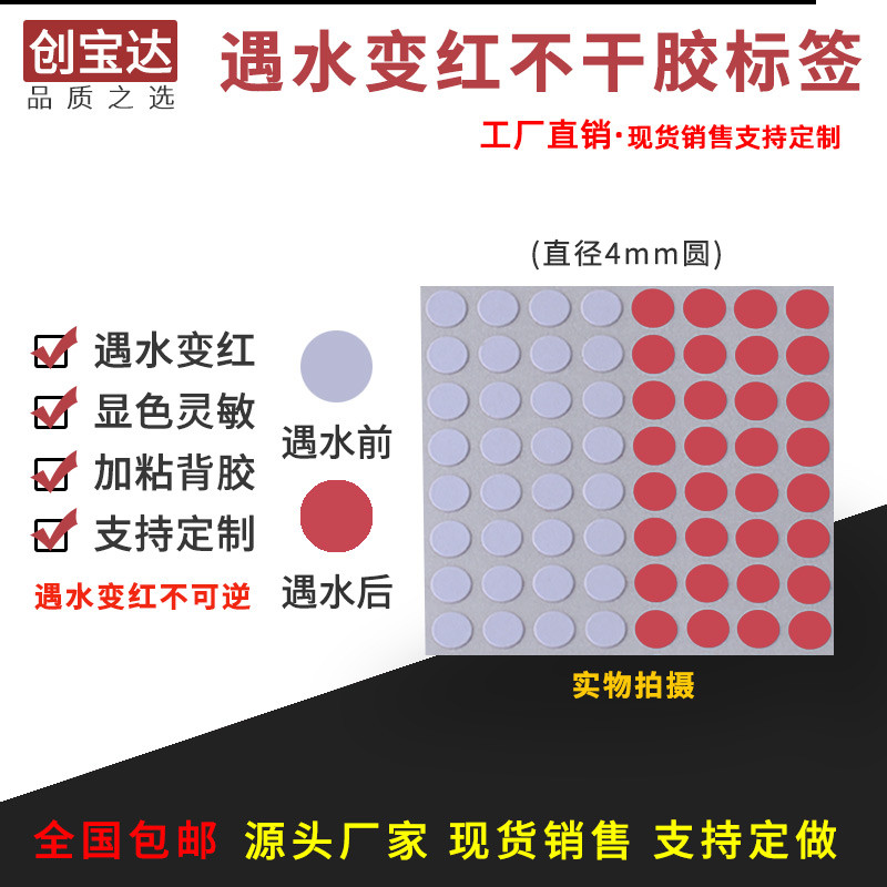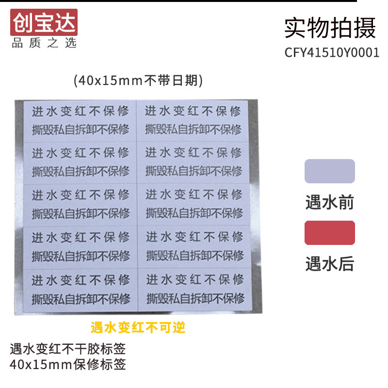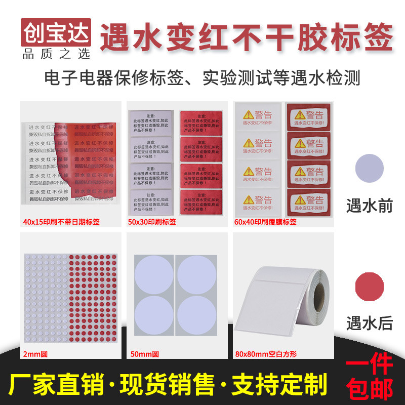 遇水變色標(biāo)簽,也稱水感標(biāo)簽。此標(biāo)簽完全遇水時(shí)將會(huì)變紅色,顏色不可逆轉(zhuǎn)。是針對目前維修服務(wù)對手機(jī)、電池、電子、電器、LCD等產(chǎn)品遇水損壞后難以識(shí)別或錯(cuò)誤識(shí)別、控制不符合條件的保修,同時(shí)也是為遠(yuǎn)洋運(yùn)輸貨物進(jìn)水鑒別、為索賠提供合法依據(jù)而開發(fā)出來的一種新型產(chǎn)品。